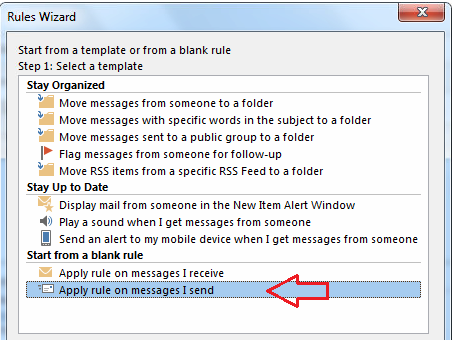 In the Step 1: Select a template box, under Start from a Blank Rule, click Apply rule on messages I send, and then click Next.