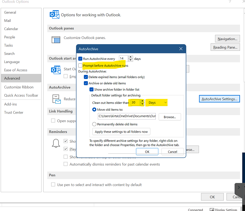 You can change how often AutoArchive runs, where it stores archived items, and how long Outlook keeps items before archiving them.